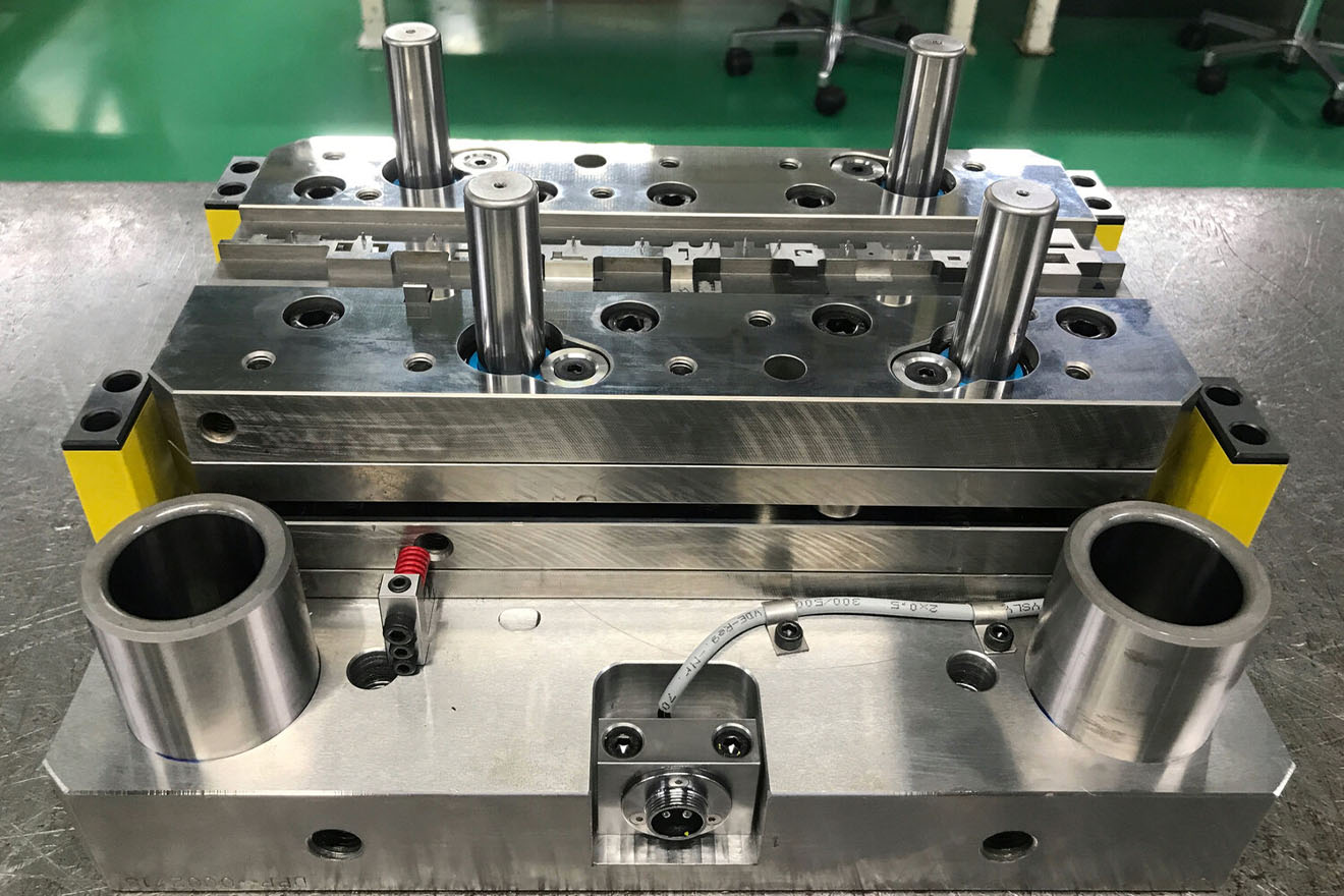 Modular dies designed for continuous, automated stamping from coil to finished part. Each press stroke performs multiple steps like blanking, forming, and trimming.